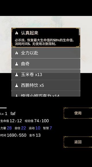 2、左下角是自己的等级、生命值、时间、金币以及经验值等信息,你会遇到很多随机事件,可以选择战斗或者逃跑。