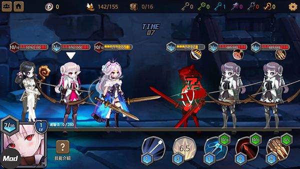 7、进入战斗界面,点击不同的角色可以选择不同的技能进行释放和攻击敌人,释放完成后会有一定的冷却时间,需要合理搭配技能使用,
