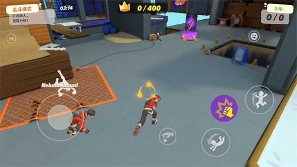 另外,忍者派对游戏还提供大乱斗等多种模式,同时在地图会刷新不同的武器,如手套、平底锅、蒸汽朋克、吉他等等,玩家需要尽可能的获取它们,它们可以帮助你更好的击打它人,使其它玩家处于晕头状态,让你更好的攻击获得分数。
