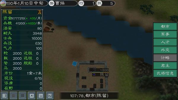 3、通过训练能够增加士兵的士气,招募士兵会减低城市的治安和气力,另外在势力信息内可观察到各方势力的详细信息。