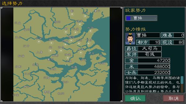 在选择了剧本后,我们就要选择势力,其实也就是主角选择,跟红警里面的国家选择有一定相似,每个势力都会有不同的武将供玩家开发。初次体验时,建议大家还是选择一些比较强势的势力,例如曹操、孙权等,不然很有可能陷入死局而玩不下去。