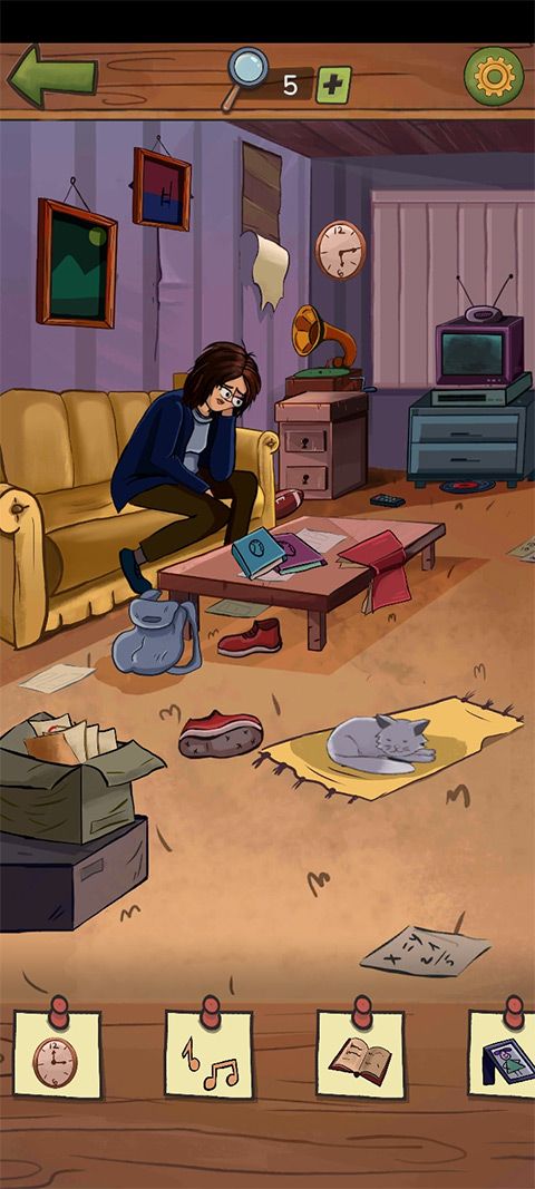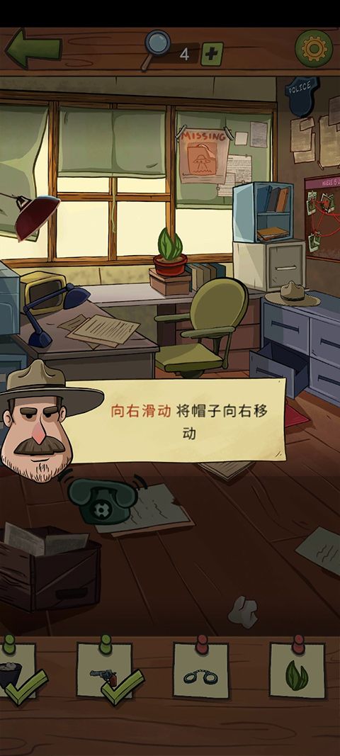 2、开始寻找乔吧,将下方便签中的物品统统在房间内找到,比如向右滑动帽子,你会发现一个铰链,点击它将这个作为案件线索收集起来吧。