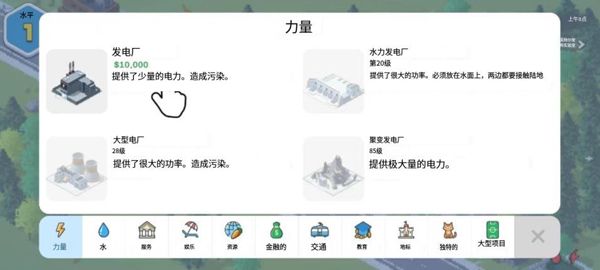 3、接下来我们建造一个发电厂吧,这个发电厂能够提供少量的电力,但是会造成污染。