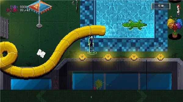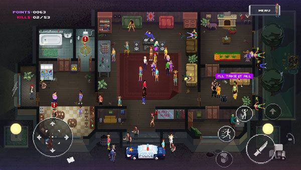 疯狂派对谋杀案汉化版是一款从steam移植过来的潜行暗杀类游戏,采用了像素风格精心制作而成,简单的形态下却隐含着丰富的玩法,玩家将扮演被家附近的party吵的睡不着的人,通过混入派对来干掉他们,你需要耐心的等待宾客落单,对其进行击杀后还要将尸体藏起来。 暗杀的方法多种多样,你可以亲自动手,也可以使用陷阱机关,最重要的是不要被怀疑。游戏背景发生于凌晨三点的豪宅当中,或许是物主过于富有,在如此深夜里还招呼了一大帮人前来举办派对,玩家扮演的主角并非这座豪宅的主人,而是一个被巨大的噪音惹怒了的愤怒青年。究竟个青年准备做什么呢?于是乎,我们的主人公决定游走于豪宅的各个房间,利用不同地方式不断杀 人。正是这种黑暗的又充满现实感的主题恰好抓住了无数玩家的心,玩家在游戏中要小心的谋划,通过观察每个人的位置,在不同的房间用不同的手段将他们消灭,注意不要被警察抓到。