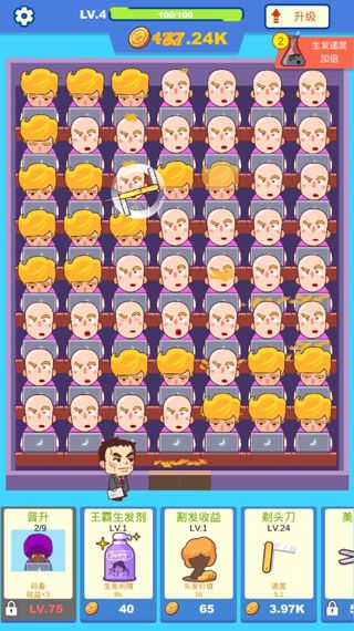 1、游戏偏放置类,我实际玩了半个小时,已经通过了。主升增加剃头收入,平衡一下就崩了,过关速度非常快。