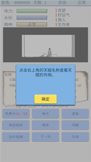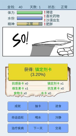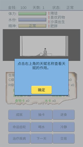 魔卡求生手游官方版是一款非常有趣的休闲益智类手机游戏,也叫做抽卡人生。在这里的一切行动都是依靠着抽卡解决的,其中水和食物也是如此,所以说这款游戏的非常考验玩家的运气和策略呢。游戏开始玩家会带有4个随机的天赋,这些天赋或多或少的会影响你抽卡的几率和生存,有好的,有坏的,还有好玩的哦,快来试试你是不是天生的欧皇吧。