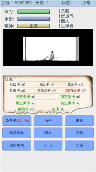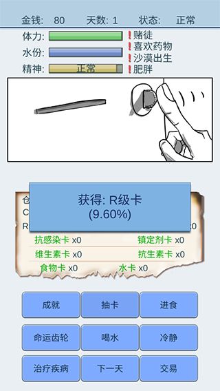2、魔卡求生也是生存游戏,抽卡的同时记得先让自己活下去,因为你的食物,水,可都是抽卡得来的。你还会生病,记得及时治疗。