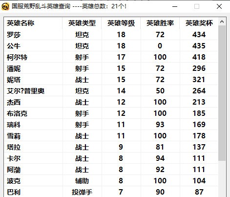 国服荒野乱斗战绩查询工具能够查询国服荒野乱斗玩家的战绩数据等,包括昵称、战队、等级、奖杯、3V3宝石胜场数、1V1单人胜场数、2V2决斗胜场数等数据!