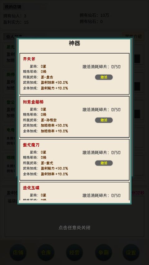 4、对于游戏内的神器,前期没必要钻石买卷开神器,除了盘古神器有显著提升,其余神器提升并没有想象中大。神器令牌建议通过种树和挂机福袋获取。