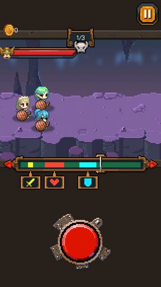 5、如果觉得金币不够用,那么我们可以选择去洞窟探索。整个探索过程,我们可以遇见三批敌人,每次敌人来之前,我们都可以使自身获得一个提高,也就是在上面的那个进度条指到相应的颜色区域时,按下红色按钮,在每一波敌人出现之前可以按下三次。蓝色可以增加防御力,黄色可以增加攻击力,红色可以增加体力。在探索完毕以后,也有一定的几率获得新的武器制作方法