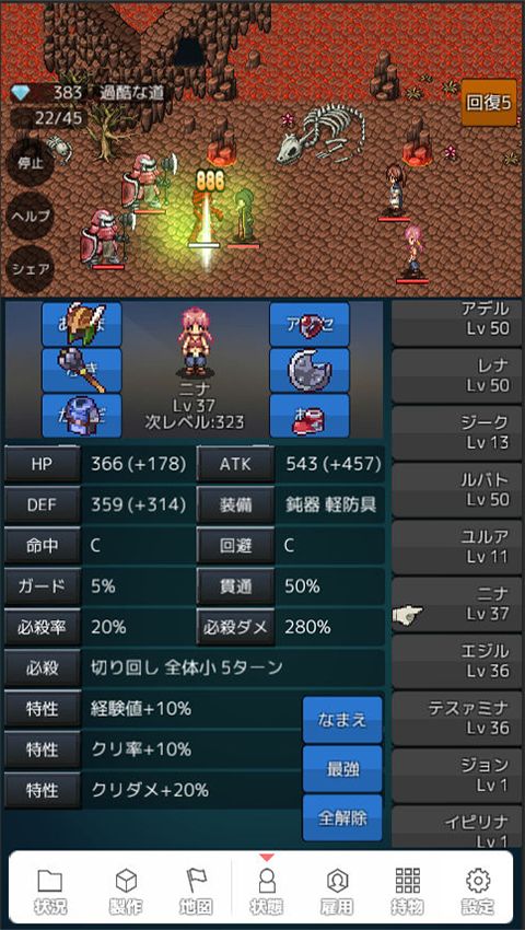 在状态画面可以确认角色状态和装备设定,最下面的是锻造师,无法外出冒险,但能够锻造道具。