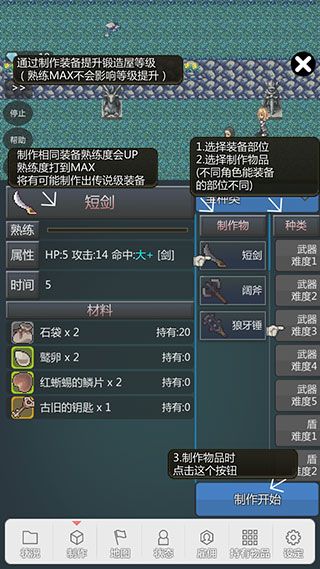 游戏的流程,在下方菜单的制作画面制作装备,提高锻造屋等级,素材从地图画面获得。