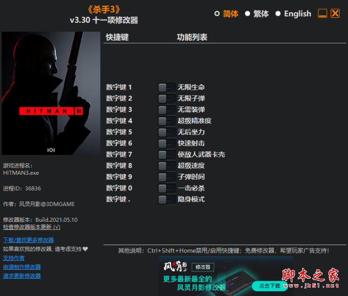 杀手3十项修改器是一款针对同名游戏推出的功能修改软件,具有无限生命、隐身模式、无限子弹、无需换弹、超级精准等十项功能,可以更好的体验本款游戏,感兴趣的玩家快来下载体验吧。