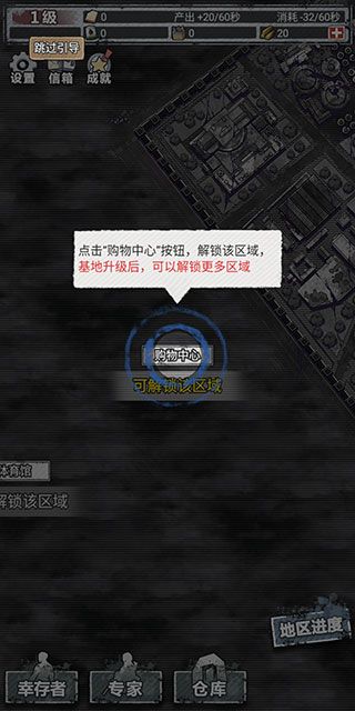 1、点击“购物中心”按钮,解锁该区域,基地升级后,可以解锁更多区域。