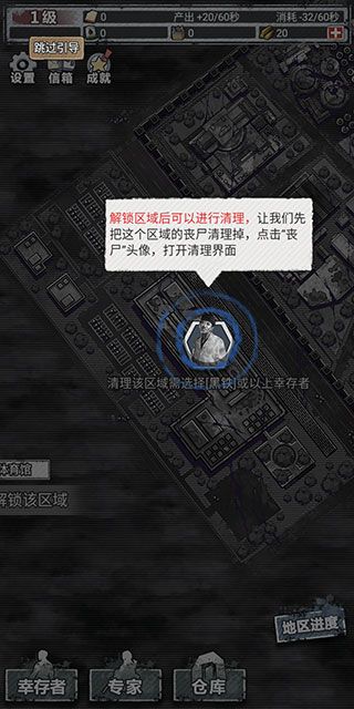 2、解锁区域后可以进行清理,让我们先把这个区域的丧尸清理掉,点击“丧尸”头像,打开清理界面。