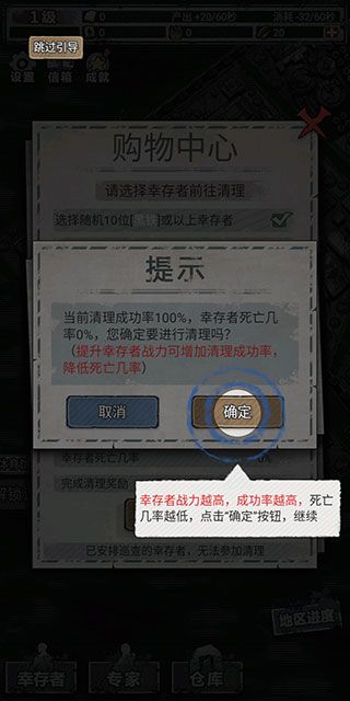 4、幸存者战力越高,成功率越高,死亡几率越低,点击“确定”按钮,继续。