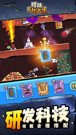 陷阱塔防大师中文版是一款趣味十足的策略放置类手游,玩家在游戏中需要设置重重的障碍和陷阱防止盗贼进入山洞偷取宝石,使用相同塔台能够合成出更加高效的塔台。随着游戏的继续,难度逐渐增加,十分考验玩家的策略能力,成功保护好宝藏即可解锁更多有趣的游戏内容和关卡设施!在不同的地上生成各种不同的防御,来击败一波波怪物,需要运气和技巧之间的良好平衡。再通过建造、出售和升级你的防御塔,不断的构建各种强大的阵容,帮助大家在陷阱塔防大师的战斗中能够顺利的完成挑战!