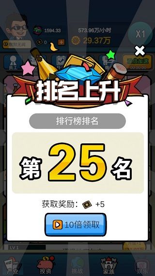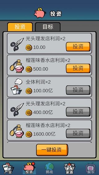 通过新手教程后,后续的玩法基本全部解锁,比如“投资”功能,在这里玩家可追加投资的项目,这些项目就是玩家产业里面的项目,通过投资可以获取更多的利润翻倍。