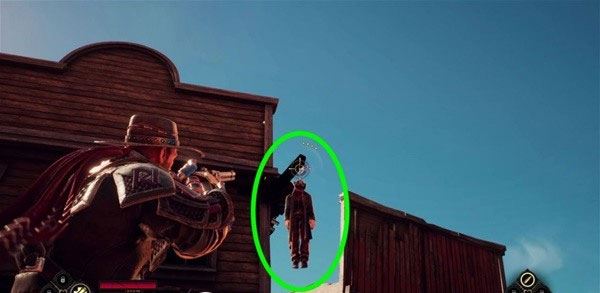 6、继续前进,手推车右侧建筑上挂着一具尸体,用枪把它打下来,拿到30钱。