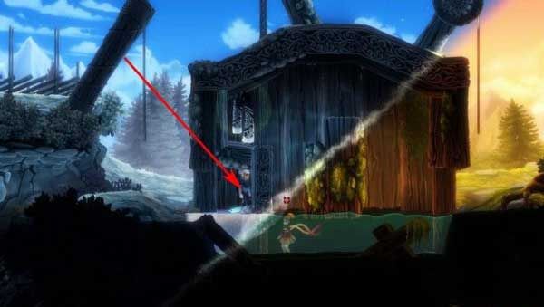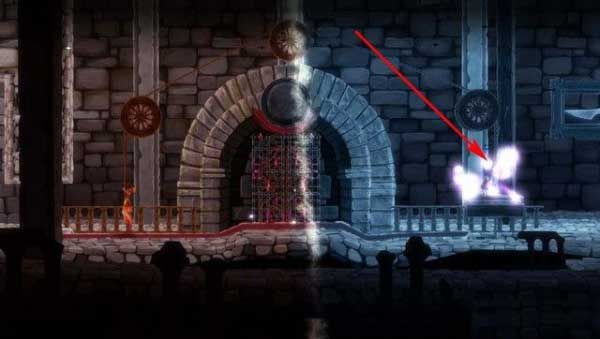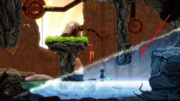 在山洞最开始,如下图箭头所指,这里的灯其实是一个机关,当灯被点亮的时候,旁边的门就会被打开,