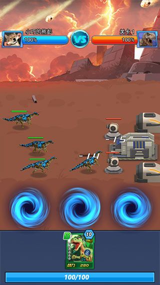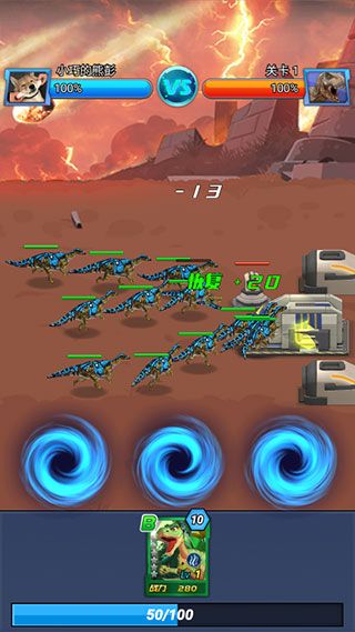 6、左右滑动视野观察敌情,将下方的卡牌拖拽到对应位置,就可以指挥恐龙上场了。
