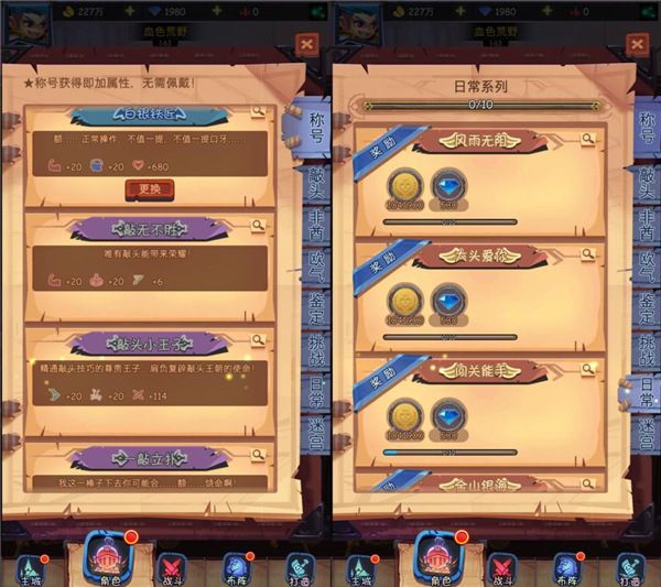 完成任务之后除了获得成就称号之外,还会获得其他奖励,包括钻石与金币,还有称号带来的属性加成,称号的分类为敲头、非酋、欧气、鉴定、挑战、日常、迷宫,不同的称号对应不同任务。