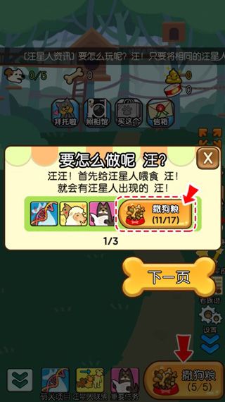 萌犬家族养成手游首先通过撒狗粮的形式对汪星人进行喂食,汪!汪!汪!就会有汪星人出现。待汪星人出现之后将相同的汪星人组合合体,就能形成在此基础上的新一代汪星人。