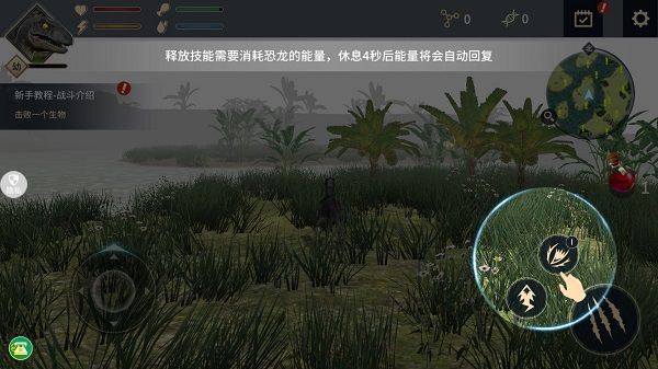1、创建好游戏存档后,进入游戏,开启新手教学模式,左侧的虚拟摇杆可以操作恐龙移动,右侧下方则为攻击按钮,在攻击按钮的左上方是技能,释放技能需要消耗恐龙能量,尝试休息后能量会自动恢复。