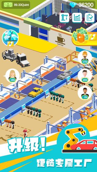 游戏中,多款车辆等你来解锁,招募拥有各种技能的人才,让他们分工合作,齐心协力帮助你赚更多的财富,回观整个游戏画面,全部采用卡通画风打造,整体的风格非常的迷人。在这里玩家主要的职责就是管理自己的汽车厂,你需要负责从生产销售的整个流程,让自己汽车业的生意越做越高。