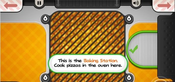 12、直接在披萨上用手指滑动即可切割,切除我们需要的模样即可,然后将屏幕上方的订单拖动到屏幕右下角的绿色纸牌上,就能将做好的披萨给顾客了。