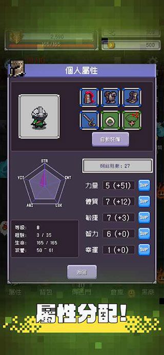 1、进入勇者大人的刷怪城游戏之后,我们先点击左下角的【属性】按钮,将前任勇者的各项属性继承过来。