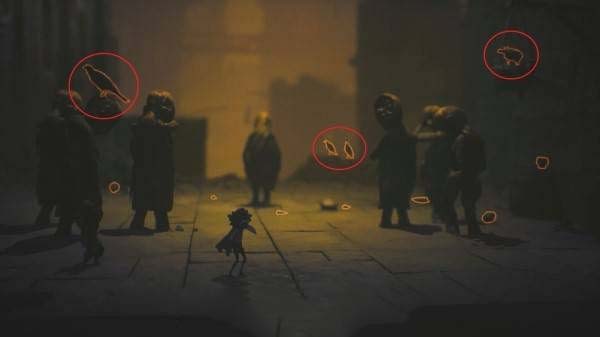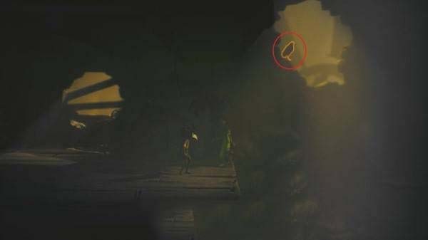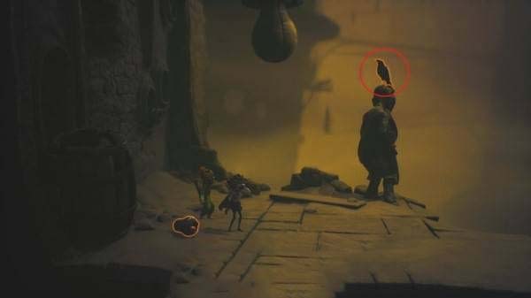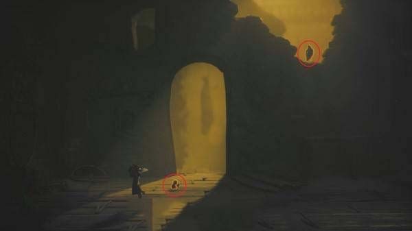 在与巨大婴儿互动(从洞中坠落)后不久,来到一个有许多雕像的区域,这里有四只乌鸦可以射击。