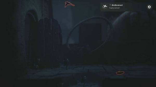 在拾取玩偶04之后不久,来到另一个有巨大婴儿的区域。在此区域高处射击这只乌鸦即可解锁【笨蛋乌鸦】奖杯。紧接着在这个区域的巨大婴儿面前还有三只乌鸦,所以如果之前漏掉了一两只也没关系。