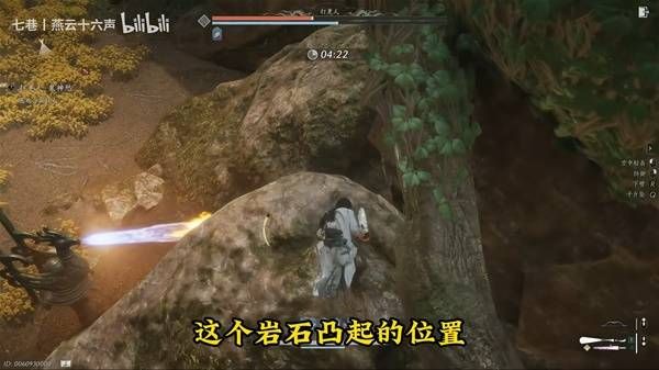 躲避完转阶段攻击后,我们跳到右下角这个岩石突起的位置,继续用扇子的轻蓄力去消耗BOSS的血量,之后就全程站桩,直到清空BOSS的血量。