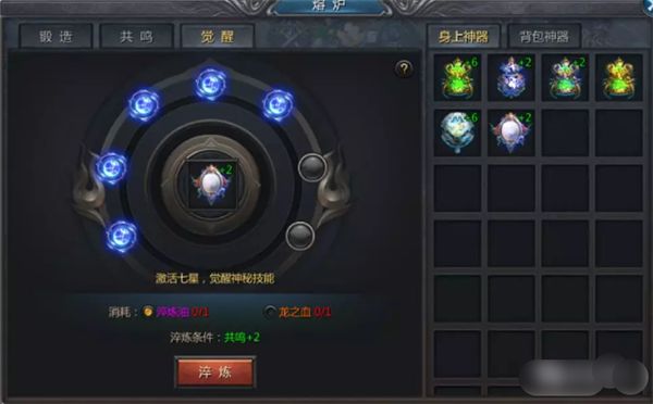 共鸣+2以上的神器都可以进行觉醒,使用淬炼油或者龙之血,成功后加一星,失败有几率熄灭一星,成功激活7星后觉醒一个神器被动技能,部分稀有神器可获得两次觉醒两个技能。