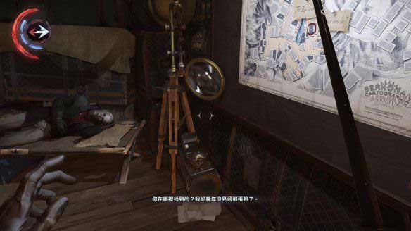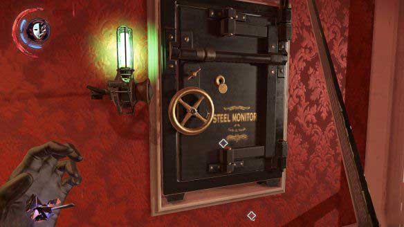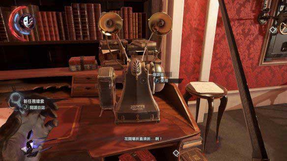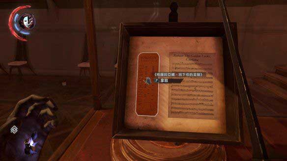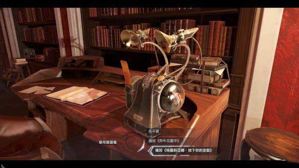 在刚刚有两个守卫的房间,看到一个保险箱,这个保险箱的打开方式是利用声谱放正确的歌。左边的桌子上就有个声谱仪,还有一张声谱,放进去后是错误的,看单云的日记,日记上写到要换一个新的声谱做密码,比如“格罗利亚娜”。在之前房子里到处可见的收藏指南中可以看到,这张声谱就被保存在自己的私人陈列室。