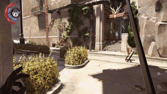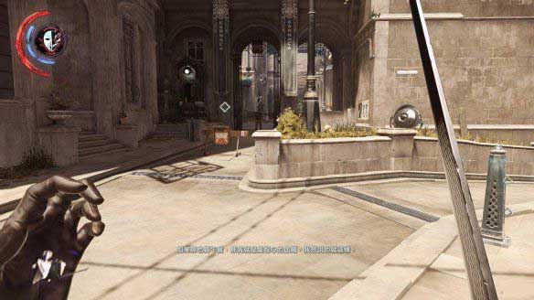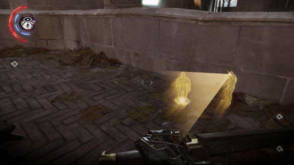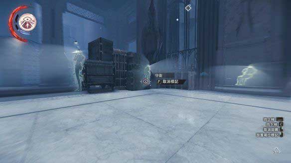 利用能力可以看到楼梯下方还有两个守卫,标记后可以看到他们的行动与目的地,利用瓶子吸引他们的注意,分别击晕。