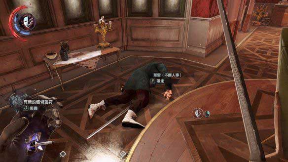 再来到三楼,正对三楼的门打开里面有两个守卫。不需要打开门,只要在门口砸破一个玻璃瓶,会有一个守卫走出来查看。搞定这个守卫后再变成这个守卫的样子进去击倒另一个守卫。还是守卫的模样时,走进单云的房间,把他也弄晕,可以在他身上找到一个骸骨符文。