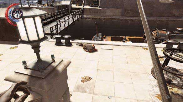 再回到刚刚跳下来的地方,有一个工人坐在这边钓鱼,把他弄晕。之后会有平民经过,看到晕倒的人会回去找守卫,耐心等候守卫过来后解决他们。