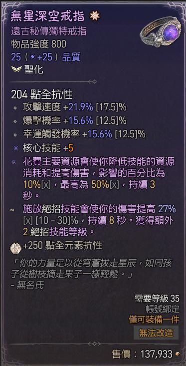 这赛季新增了圣化功能,而且法师多了一把很强的钉锤,就没有特定一定要很精准的装备词缀,只要感觉差不多的装备就可以来圣化看看有没有机会出现好的效果,例如我准备了多个19-20%也精铸到重要属性的塔拉夏戒指去圣化,但最后没有一个好的,到后来常常会没有重新精铸的材料可以用,最后都直接拿只要超过18%特效以上的就去圣化,好在总算有一个出现军帽的效果。