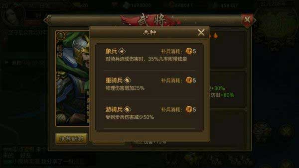 推荐:象兵(吕布伤害高,兵种可有可无,碰见骑兵武将能眩晕就行,碰不到象兵也不容易被对方兵种克)