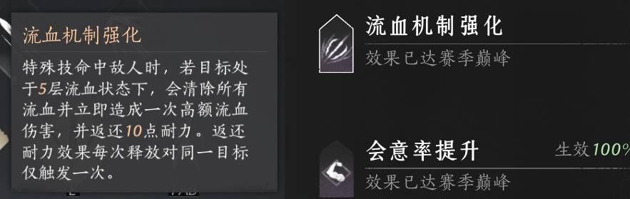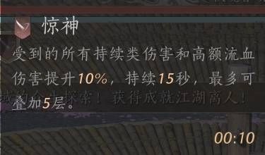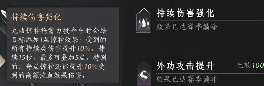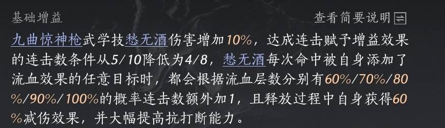 结合以上这些原因,所以如果我们想要获得强效江流,那么最优的选择就是保证每次在使用枪武学技愁无酒转转转之前,目标身上至少有3到5层的流血,这样才能比较好的保证我们基本能吃到强效江流的buff。这样一来我们就需要一个能稳定先给目标添加五层流血的手段才好,那么是什么手段呢?