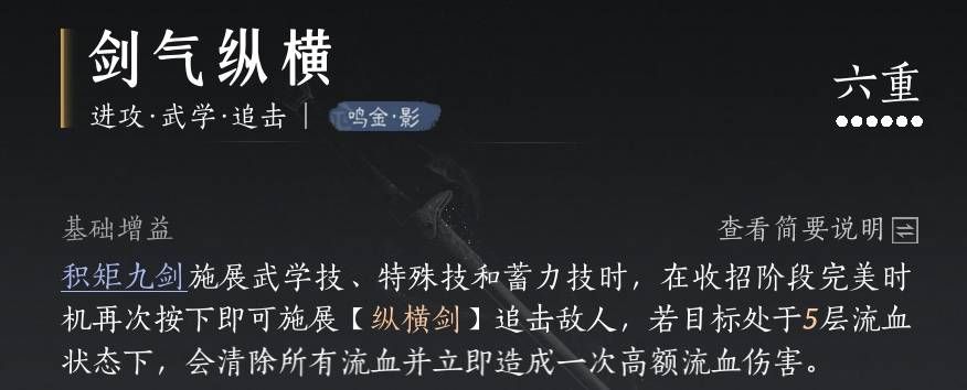流血最多叠加五层,五层时会被纵横剑和特殊技引爆。纵横剑解锁来源于心法剑气纵横给予,如下图所示