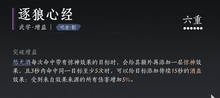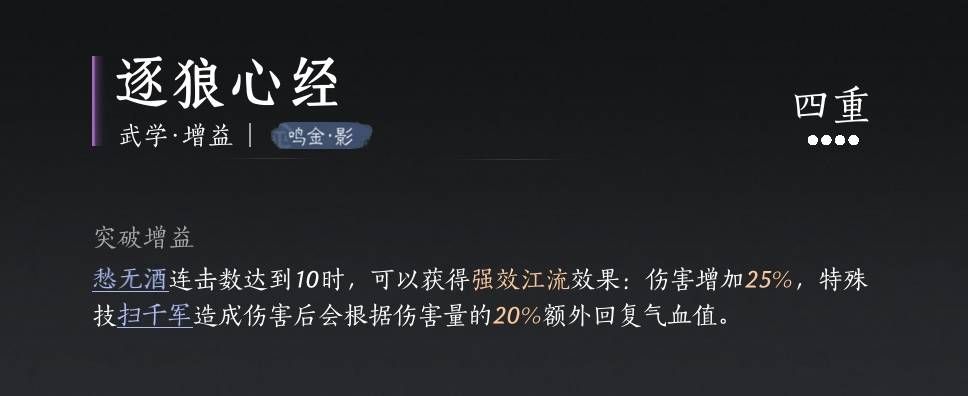 在不携带逐狼心经的时候,愁无酒最高可以获得江流buff,而在携带逐浪心经以后,由于逐浪心经的效果