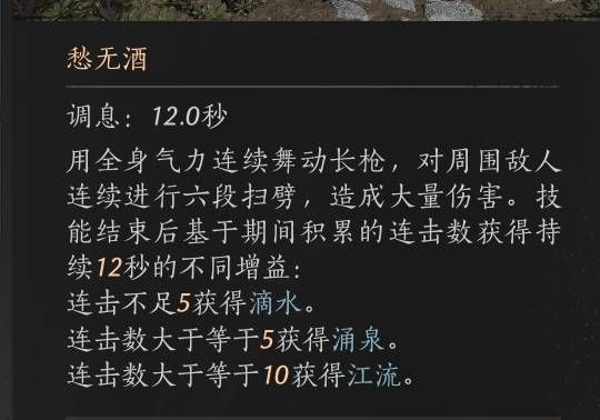 但问题来了,我们看愁无酒的描述可以看到,愁无酒是对周围敌人造成6段伤害,也就是说如果是群怪还好,每个小怪都能加一连击数,很容易达到10以上,可如果只有单一目标,那最多只能到6的连击,该怎么办才能吃到强效江流的buff呢?