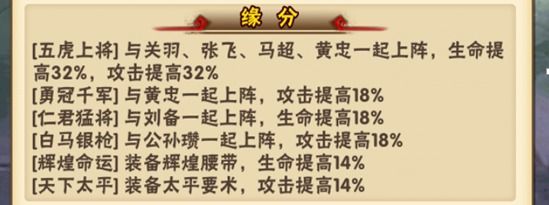 五虎上将:与关羽、张飞、赵云、马超一起上阵,生命提高32%,攻击提高32%
