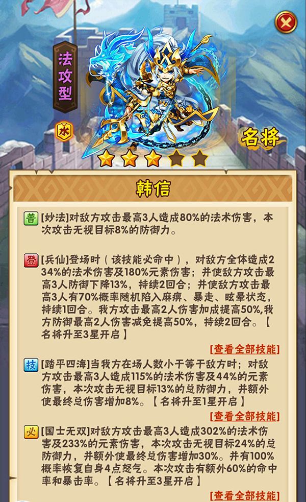 名将方面,韩信是主角的不二选择,5星韩信几乎是翻版的蜀王,无限大招和必定命中、必定暴击的恐怖技能让韩信成为输出最稳定的名将。由于赤壁赛场的赛制不像逐鹿那样一段血打完全程,因此名将的好坏往往会成为决定胜负的关键因素,而我们要做的仍然是追求稳定。