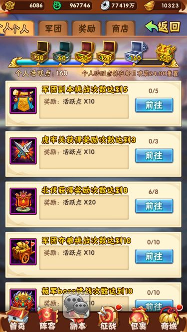活跃度方面不管三七二十一,尽力做满200的活跃度,从中还能获得精力丹奖励。周一如果是军团战开启的那周,周一活跃度165即可。
