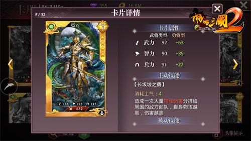 在啪啪三国2中,赵云手握龙胆亮银枪,他的枪法劲道飘逸,其武将技能“长坂坡之勇”造成一次大量物理伤害分摊给周围的敌方部队,自身物攻越高,伤害越高。面对千军万马亦可爆发潜能,有排山倒海之势。