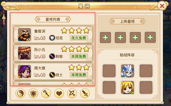 左下红框是星将职业分类,点击其中一个图标星将列表会将该职业所有星将显示出来。